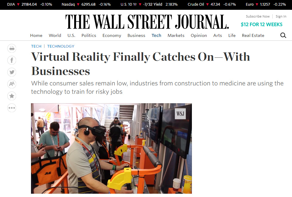 The JLG Immersive Training Simulator was included in a June 5th, 2017 Wall Street Journal article, Virtual Reality Finally Catches On—With Businesses, by Betsy Morris. JLG’s training-system simulator, built by San Francisco-based ForgeFX Simulations, is networked so that multiple trainees across the globe can operate virtual machines in the same 3D construction site—all without leaving the ground. JLG says it plans to begin marketing the training programs as soon as July to as many as 50 customers who have asked for it.